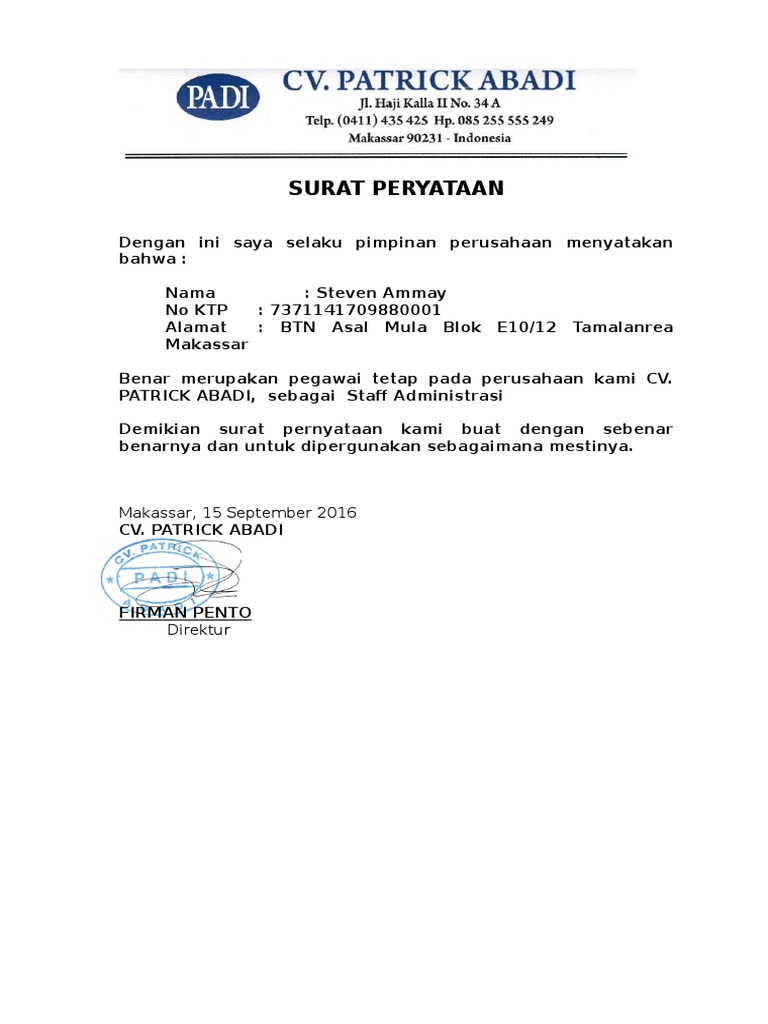 By posted on august 15, 2021. Contoh surat keterangan kerja seiring dengan perkembangan teknologi dan kecanggihan komunikasi sekarang ini surat sebagai media. Kumpulan gambar tentang contoh surat pegawai tetap, klik untuk melihat koleksi gambar lain di kibrispdr.org Contoh surat keterangan kerja karyawan tetap. 3.3 contoh sk pengangkatan karyawan swasta lengkap 3. Berikut ini adalah contoh surat keterangan bekerja yang bisa anda gunakan. Format surat keterangan kerja sebagia karyawan tetap terdiri atas bagian pembuka, isi, dan penutup. Isi surat isi surat keterangan karyawan biasanya menjelaskan beberapa poin. Download contoh surat perjanjian kerja karyawan tetap pegawai bumn. Contoh surat pengangkatan karyawan tetap buat anda cara download contoh surat pengangkatan karyawan tetap buat anda cara download format surat lain: 19112020 contoh surat keterangan kerja pegawai tetap contoh surat keterangan karyawan surat keterangan karyawan sering kali disebut juga sebagai surat keterangan kerja dimana surat ini biasanya digunakan sebagai alat bantu yang menerangkan bahwa seseorang merupakan karyawan yang sedang aktif bekerja di suatu perusahaan. Salah satunya dengan sk dimana ini adalah bukti seseorang merupakan bagian dari perusahaan terlebih lagi sebagai bukti untuk meniti jenjang karier yang lebih tinggi lagi. Berikut ini contoh surat keterangan karyawan untuk berbagai keperluan.